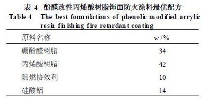 213防火涂料最優配方 在前期預備試驗的基礎上,根據正交試驗結果,確定了酚醛改性丙烯酸樹脂飾面防火涂料的最優配方,見表4。