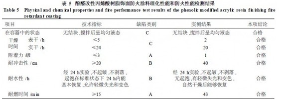 表4 酚醛改性丙烯酸樹脂飾面防火涂料最優配方 涂料平均耐燃時間為43min,遠遠超過了國家標準中耐燃15min的要求。同時,通過與其他防火涂料耐燃時間的比較實驗表明,該酚醛改性丙烯酸樹脂飾面防火涂料的防火性能明顯優越,說明該配方是確實可行的。 214涂料理化性能和防火性能評價 根據GB12441—2005規定的方法檢測了防火涂料的理化性能,通過模擬大板燃燒法檢測了涂料的防火性能,并與國家標準所規定的指標進行了比較,實驗結果見表5。