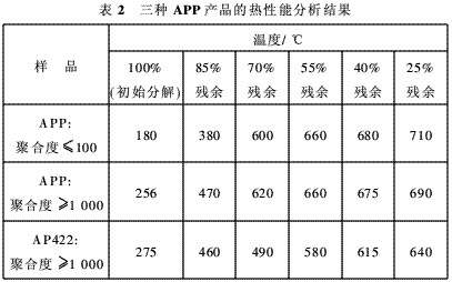 Ⅱ型的化學結構 通過X射線粉末衍射,Ⅰ型APP(通常聚合度≤100)的晶體結構有著不規(guī)則的表面,是一種多孔物質。Ⅱ型APP(通常聚合度≥1000)的晶體結構是一種正交結構,晶體具有光滑的表面,晶體中存在交聯(lián)結構。筆者對Ⅰ型和Ⅱ型APP產品做了熱分析試驗(TG),發(fā)現(xiàn)所選三種APP產品的熱穩(wěn)定性的差距是明顯的,見表2。