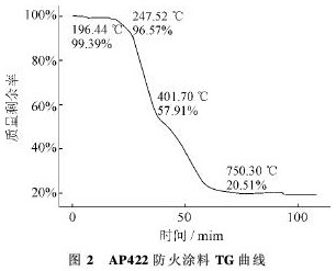 圖2 AP422防火涂料TG曲線 從兩種涂料涂層的TG曲線可以看出,雖然APP的聚合度相同,但國內原材料(APP1000)的影響還是比較明顯的,根據(jù)分析,可能是溶劑和APP的材質對試驗結果產生的影響,涂料低溫時的失重有可能是溶劑中的雜質和APP分子量分布較寬造成的。 |
